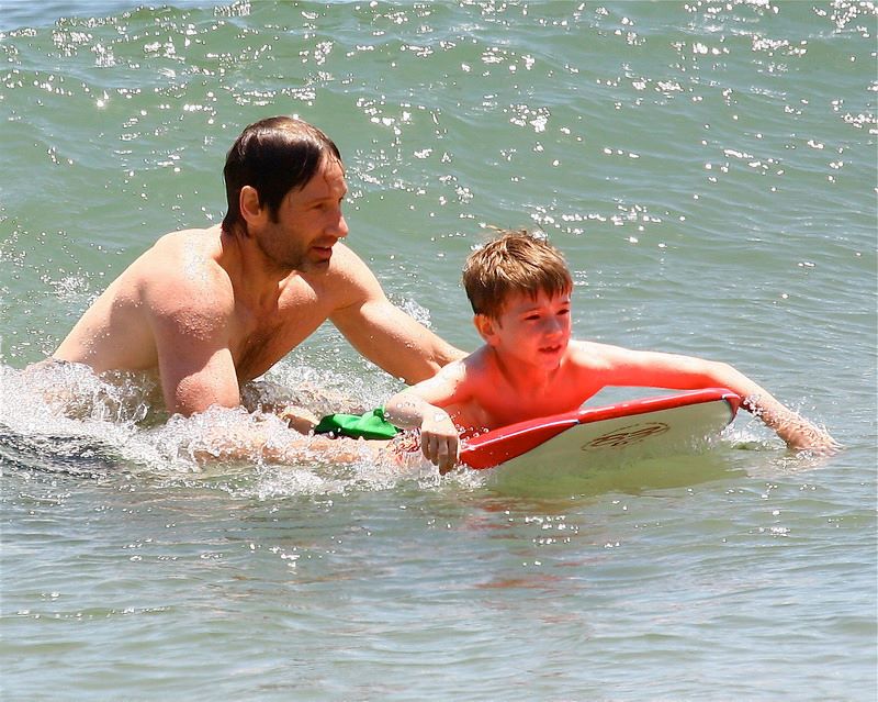 Ο ηθοποιός Ντέιβιντ Ντουκόβνι στην παραλία του Μαλιμπού μαζί με το γιο του, Κιντ.