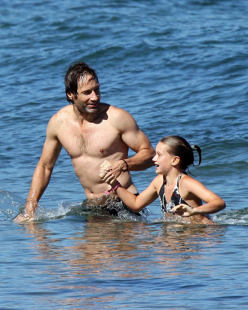 Ο, εντυπωσιακά γυμνασμένος, Ντέιβιντ Ντουκόβνι με την κόρη του παίζουν με τα κύματα στο Μαλιμπού. Η σύζυγος του ηθοποιού, Τέα Λεόνι, κάθησε στην παραλία με τα δύο της παιδιά, όσο ο 49χρονος ηθοποιός έκανε surfing. Η Αλεσάντρα Αμπρόσιο με το σύζυγό της και την κόρη της στο Μαλιμπού. Λίγο αργότερα το ζευγάρι κατευθύνθηκε σε φιλικό σπίτι όπου περάσαν το υπόλοιπο της ημέρας.