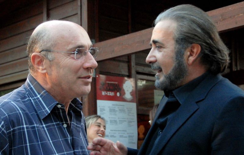Ο Γιώργος Λούκος συζητά με τον Λάκη Λαζόπουλο λίγο πριν από την έναρξη της παράστασης.