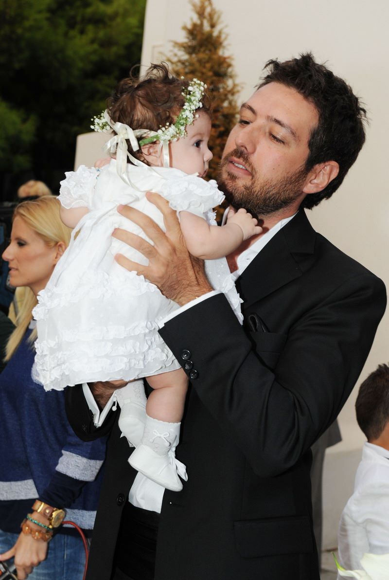 Ο Μάνος Παπαγιάννης με την 4 μηνών κόρη του. Το ζευγάρι λίγο πριν επιβιβαστεί στο αυτοκίνητο που θα τους οδηγούσε στο χώρο της δεξίωσης.