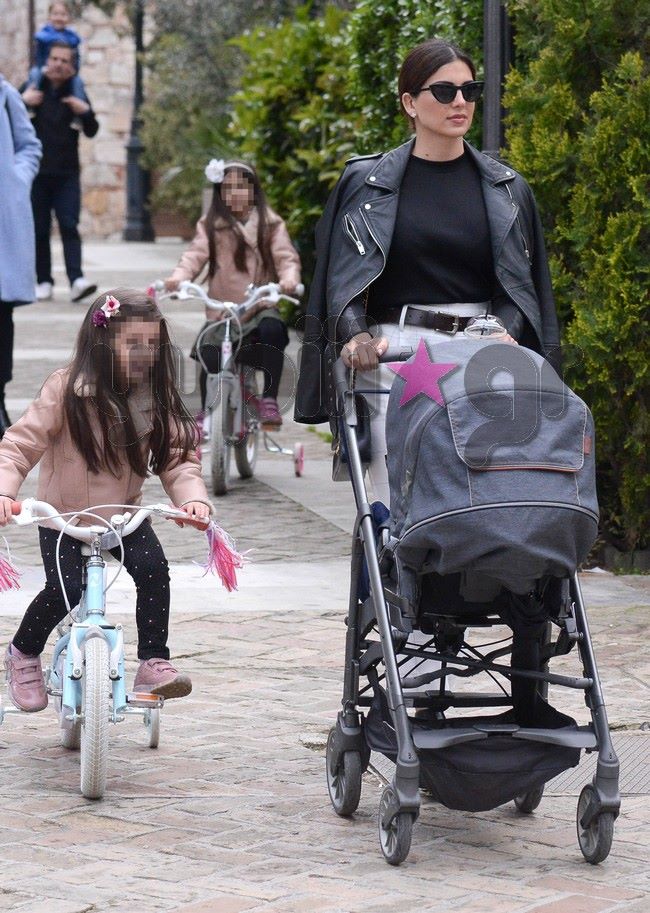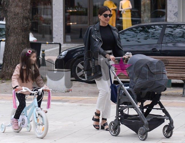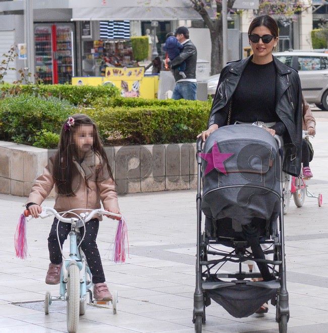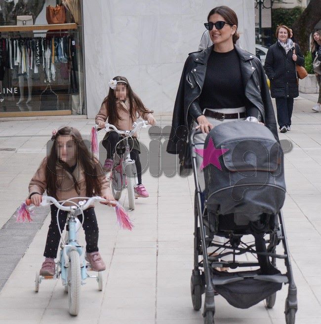 Με χαλαρή διάθεση και πάντα καλοντυμένη, η Σταματίνα Τσιμτσιλή περπάτησε στους δρόμους της περιοχής, την ίδια ώρα που οι κόρες τους απολάμβαναν τη βόλτα τους κάνοντας ποδήλατο.