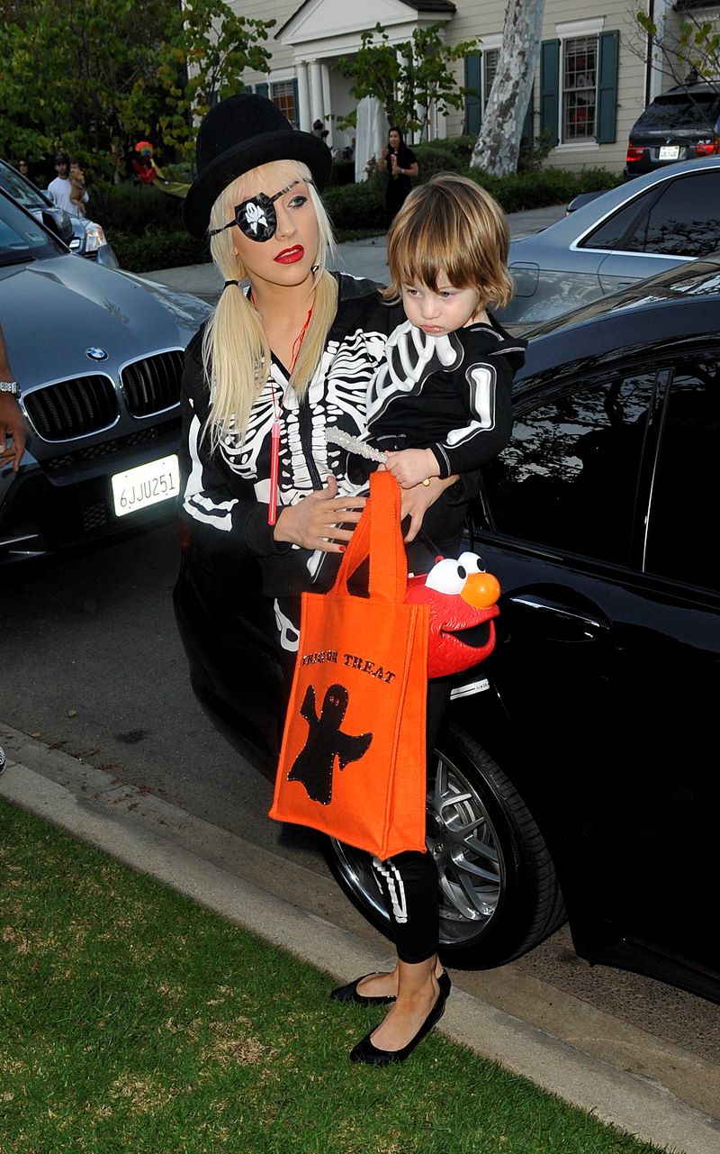 Κριστίνα Αγκιλέρα κρατά το γιο της, Μαξ, στην αγκαλιά της, καθώς βγαίνει από το αυτοκίνητό της, ενώ η
