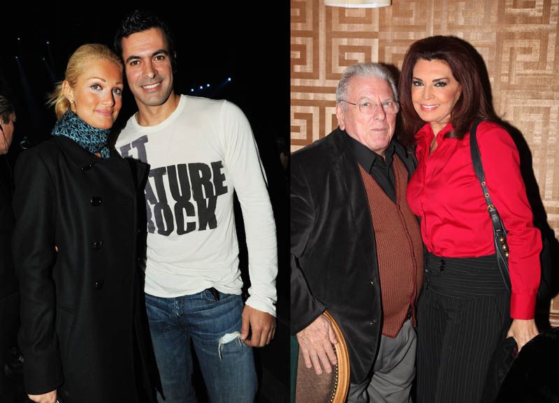 Αριστερά: Η Νατάσα Θεοδωρίδου ποζάρει στους φωτογράφους με το φίλο της, Νίκο Παπαδάκη. Δεξιά: Η Μιμή Ντενίση με το συμπρωταγωνιστή της στο θέατρο, Κώστα Βουτσά.