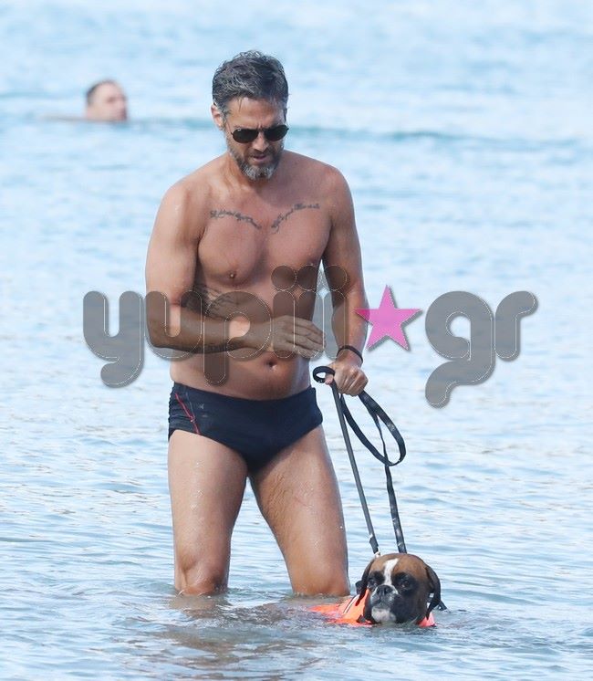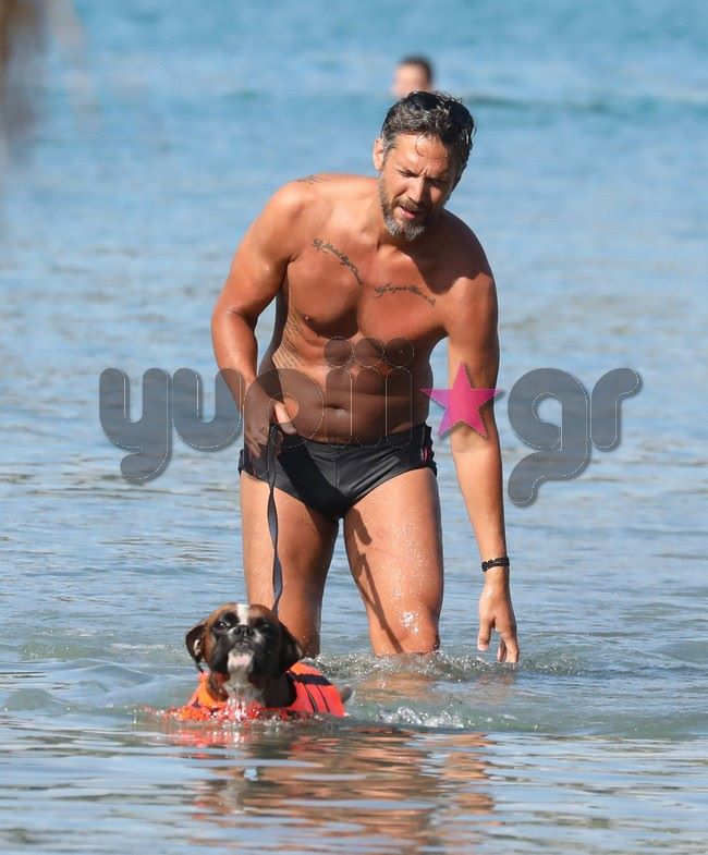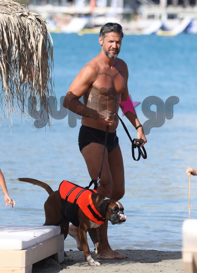 Μαζί με τον αγαπημένο του τετράποδο φίλο, απόλαυσε το μπάνιο του στο Καβούρι και μαγνήτισε τα βλέμματα με το καλογυμνασμένο του σώμα.
