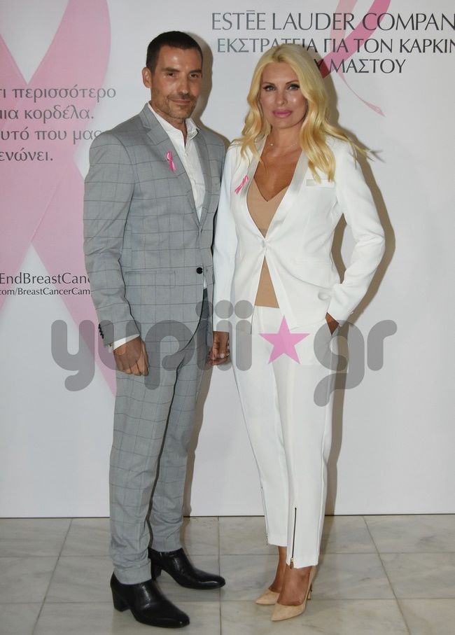 Η Ελένη Μενεγάκη επέλεξε και αυτή τη φορά ένα λευκό κοστούμι, το αγαπημένο της χρώμα διαχρονικά σε κάθε σημαντική στιγμή της επαγγελματικής της πορείας, ενώ στο πλευρό της ήταν ο Δούκας Χατζηδούκας που σχεδίασε και φέτος το ροζ βραχιόλι που κυκλοφορεί κάθε χρόνο στο πλαίσιο της ίδιας ενέργειας της Estee Lauder Companies.