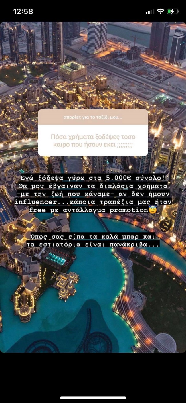 Μάλιστα, αρκετοί σχολίασαν το γεγονός πως ταξίδεψε κατά τη διάρκεια της καραντίνας. Έτσι, η γνωστή influencer απάντησε στις ερωτήσεις των ακολουθων της μέσω του προσωπικού της λογαριασμού στο instagram. Μια από αυτες αφορούσε τα πόσα χρήματα ξόδεψε όσο καιρό βρισκόταν εκει και εκείνη απάντησε πως: