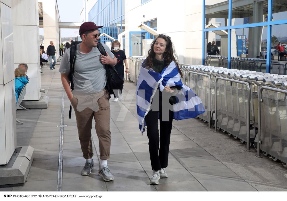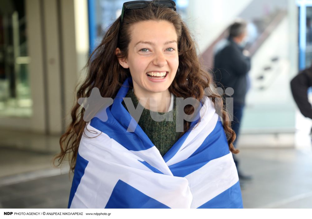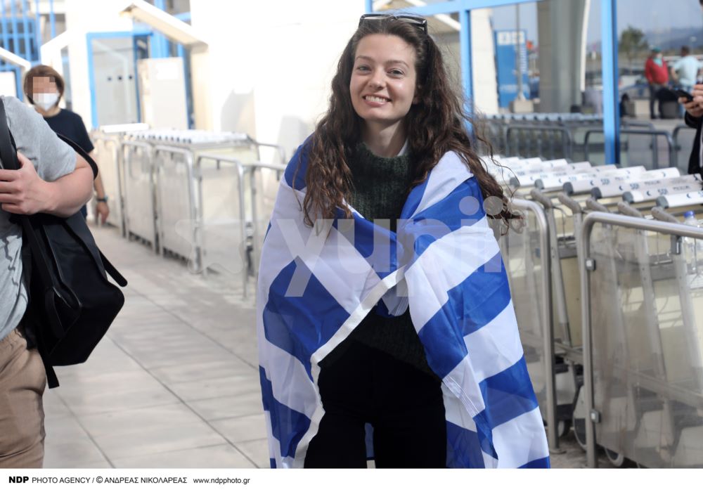 Τυλιγμένη με την Ελληνική Σημαία, και φανερά ενθουσιασμένη χαμογέλασε στους φωτογράφους αλλά και στα τηλεοπτικά συνεργεία που την περίμεναν. Από το πλευρό της δεν έλειπε ο Φωκας Ευαγγελινός.