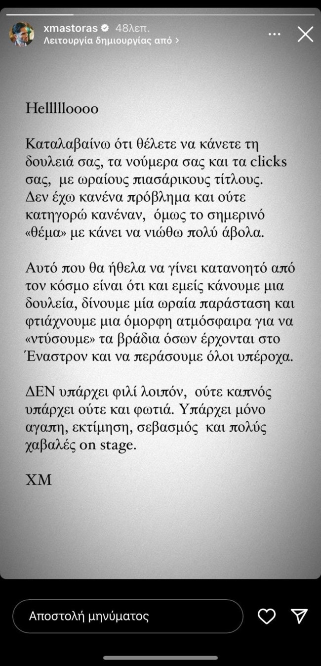 Αναλυτικότερα, ο Χρήστος Μάστορας σημειώνει στην ανάρτησή του: "Καταλαβαίνω ότι θέλετε να κάνετε τη δουλειά σας, τα νούμερά σας, τα clicks σας με ωραίους πιασάρικους τίτλους. Δεν έχω κανένα πρόβλημα και ούτε κατηγορώ κανέναν, όμως το σημερινό "θέμα" με κάνει να νιώθω πολύ άβολα. Αυτό που θα ήθελα να γίνει κατανοητό από τον κόσμο είναι ότι κι εμείς κάνουμε μια δουλειά, δίνουμε μια ωραία παράσταση και φτιάχνουμε μια όμορφη ατμόσφαιρα για να "ντύσουμε" τα βράδια όσων έρχονται στο "Έναστρον" και να περάσουμε όλοι υπέροχα. Δεν υπάρχει φιλί λοιπόν, ούτε καπνός υπάρχει ούτε και φωτιά. Υπάρχουν όμως αγάπη, εκτίμηση, σεβασμός και πολύς χαβαλές on stage".