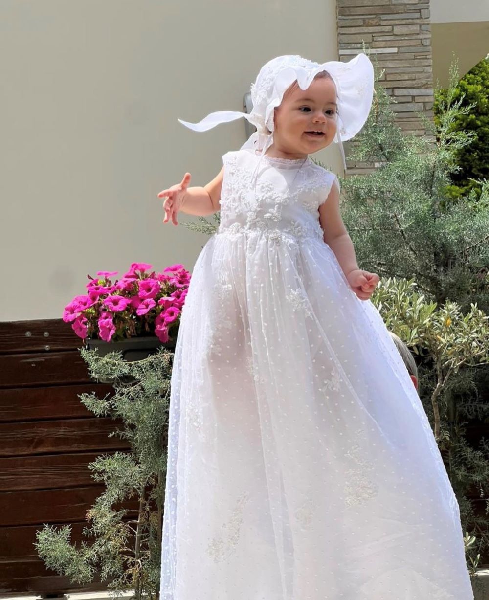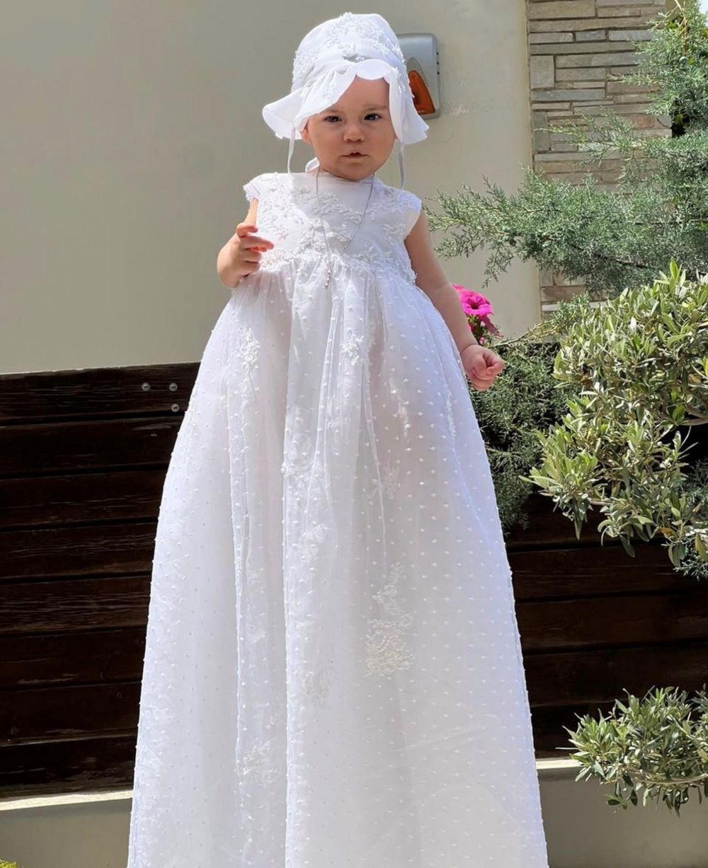 Αξίζει να σημειωθεί ότι η μικρή πήρε το όνομα Μαρία-Δήμητρα και έλαμπε μέσα στο φόρεμά της από την Celia Kritharioti, ένα μεταξωτό πουά με γαλλικές δαντέλες και κρύσταλλα Swarovski.