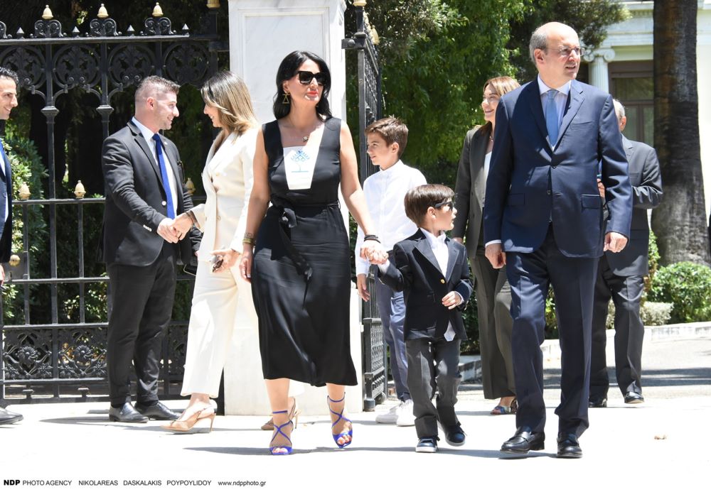 Άδωνις Γεωργιάδης και Ευγενία Μανωλίδου με τους γιους τους, Περσέα και Αλκαίο, έξω από το Προεδρικό Μέγαρο