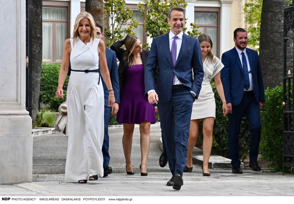 O Κυριάκος Μητσοτάκης με τη σύζυγό του, Μαρέβα, και τα παιδιά τους, Κωνσταντίνο, Δάφνη και Σοφία στο Μέγαρο Μαξίμου