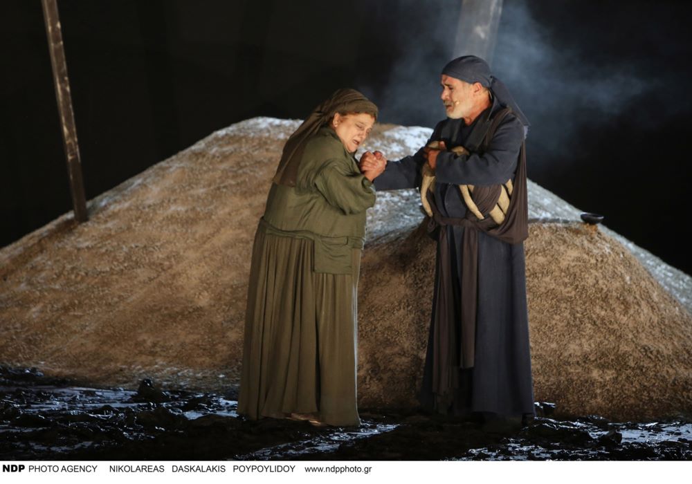 Στις «Βάκχες» παίζει και η Βίκυ Βολιώτη, που εμφανίζεται ως Τειρεσίας. Στη φωτογραφία με τον Λάζαρο Γεωργακόπουλο.