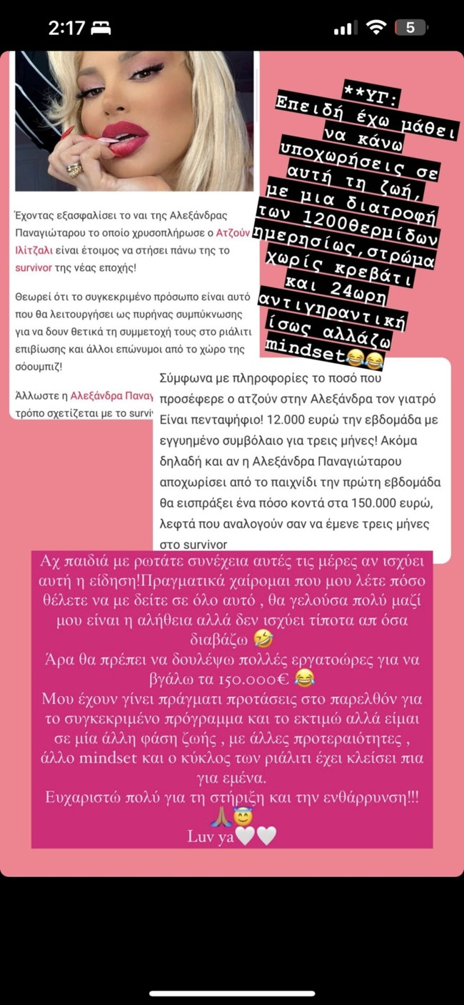 "Αχ παιδιά με ρωτάτε συνέχεια αυτές τις ημέρες αν ισχύει αυτή η είδηση. Πραγματικά χαίρομαι που μου λέτε πόσο θέλετε να με δείτε σε όλο αυτό, θα γελούσα πολύ μαζί μου είναι η αλήθεια αλλά δεν ισχύει τίποτα από όσα διαβάζω. Άρα θα πρέπει να δουλέψω πολλές εργατοώρες για να βγάλω τα 150.000 ευρώ. Μου έχουν γίνει πράγματι προτάσεις στο παρελθόν για το συγκεκριμένο πρόγραμμα και το εκτιμώ αλλά είμαι σε μία άλλη φάση ζωής, με άλλες προτεραιότητες, άλλο mindset και ο κύκλος των ριάλιτι έχει κλείσει πια για εμένα. Ευχαριστώ πολύ για τη στήριξη και την ενθάρρυνση! Luv ya! Επειδή έχω μάθει να κάνω υποχωρήσεις σε αυτή τη ζωή, με μία διατροφή των 1200 θερμίδων ημερησίως, στρώμα χωρίς κρεβάτι και 24ωρη αντιγηραντική, ίσως αλλάξω mindset", έγραψε χαρακτηρστικά.
