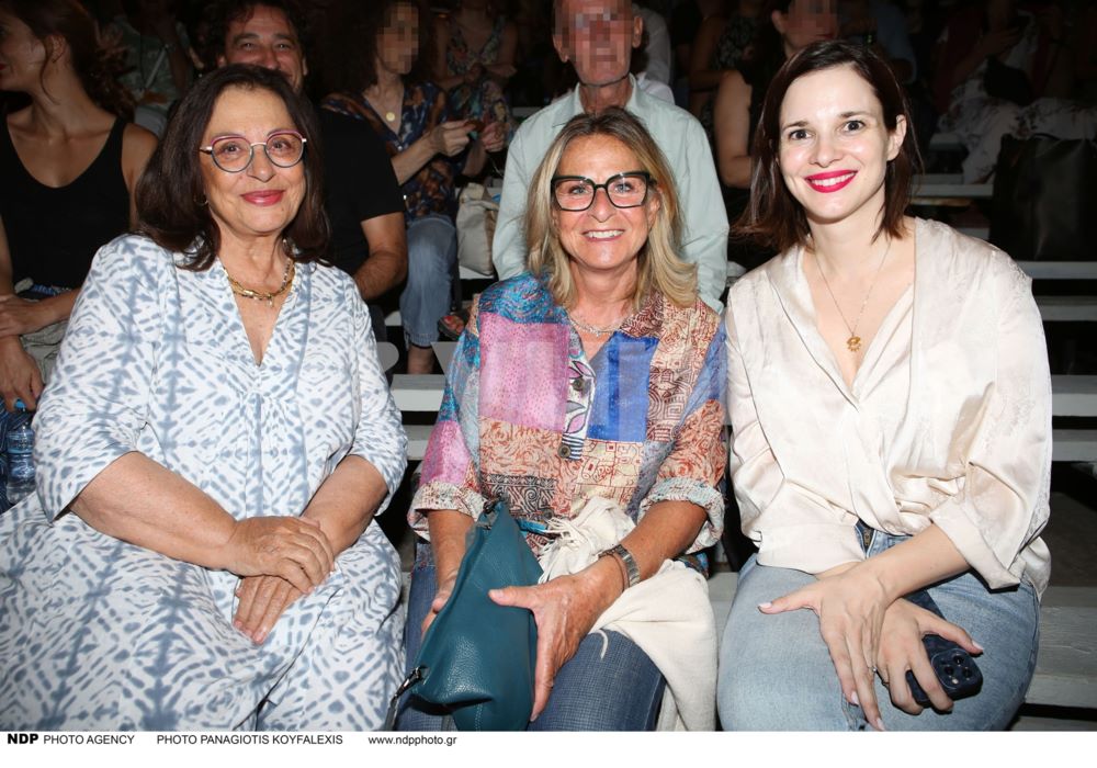 Η Χάρις Αλεξίου με την Όλγα Παυλάτου και την Ευγενία Δημητροπούλου στο θέατρο Βράχων.