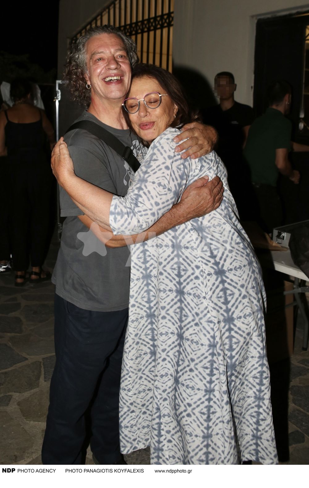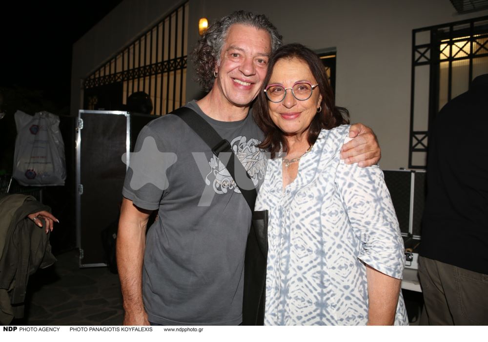 Ο Γιάννης Τσορτέλης αγκαλιά με τη Χάρις Αλεξίου στο θέατρο Βράχων.