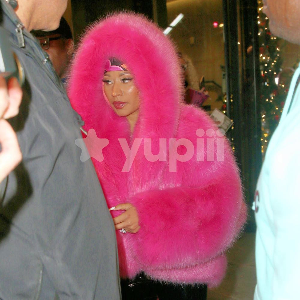 Η Nicki Minaj φεύγοντας από το "Watch What Happens Live" με ένα ροζ γούνινο παλτό στη Νέα Υόρκη.