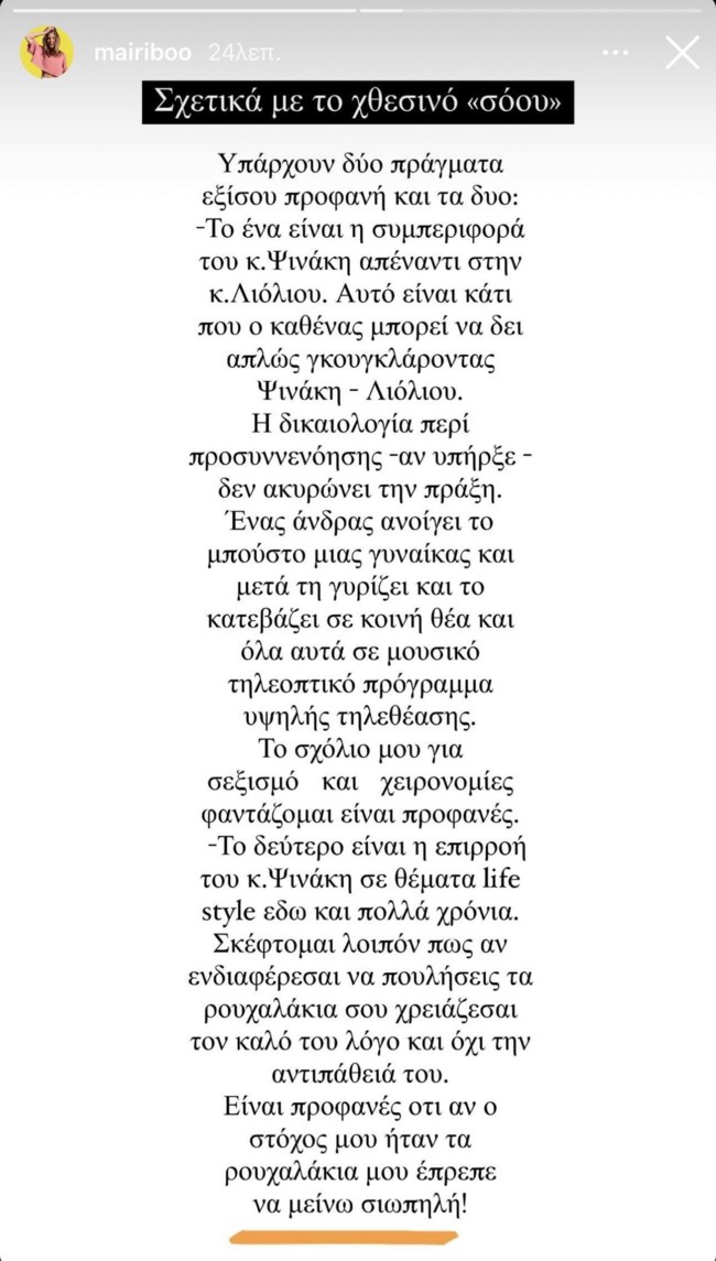 "Σχετικά με το χθεσινό "σόου”. Υπάρχουν δυο πράγματα εξίσου προφανή και τα δυο: Το ένα είναι η συμπεριφορά του κύριου Ψινάκη απέναντι στην κυρία Λιόλιου. Αυτό είναι κάτι που ο καθένας μπορεί να δει απλώς γκουγκλάροντας, Ψινάκη-Λιόλιου. Η δικαιολογία περί προσυνεννόησης – αν υπήρξε – δεν ακυρώνει την πράξη. Ένας άνδρας ανοίγει το μπούστο μιας γυναίκας και μετά τη γυρίζει και το κατεβάζει σε κοινή θέα και όλα αυτά σε μουσικό τηλεοπτικό πρόγραμμα υψηλής τηλεθέασης. Το σχόλιό μου για σεξισμό και χειρονομίες φαντάζομαι είναι προφανές. Το δεύτερο είναι η επιρροή του κυρίου Ψινάκη σε θέματα Lifestyle εδώ και πολλά χρόνια. Σκέφτομαι λοιπόν πως αν ενδιαφέρεσαι να πουλήσεις τα ρουχαλάκια σου, χρειάζεσαι τον καλό του λόγο και όχι την αντιπάθειά του. Είναι προφανές ότι αν ο στόχος μου ήταν τα ρουχαλάκια μου, έπρεπε να μείνω σιωπηλή" είπε η Μαίρη Συνατσάκη.