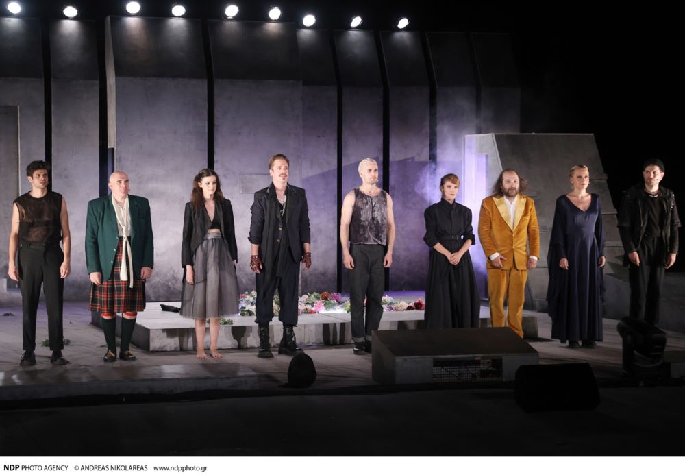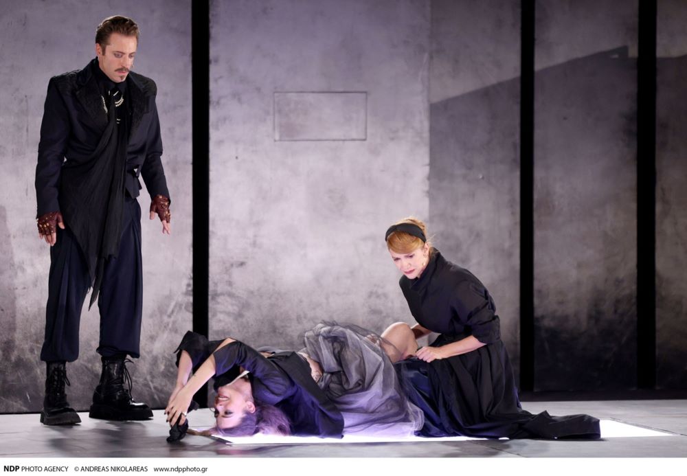Ο Μιχάλης Συριόπουλος ως Κλαύδιος, η Τζένη Καζάκου ως Οφηλία και η Ιωάννα Παππά ως Γερτρούδη.