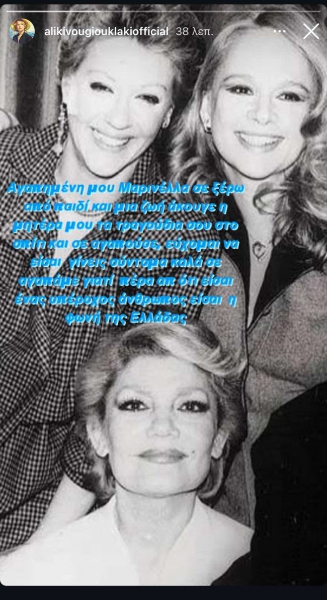 Το δικό του μήνυμα στη Μαρινέλλα έστειλε δημοσίως ο Γιάννης Παπαμιχαήλ, μέσα από τον επίσημο λογαριασμό της μητέρας του, της Αλίκης Βουγιουκλάκη, στο instagram.