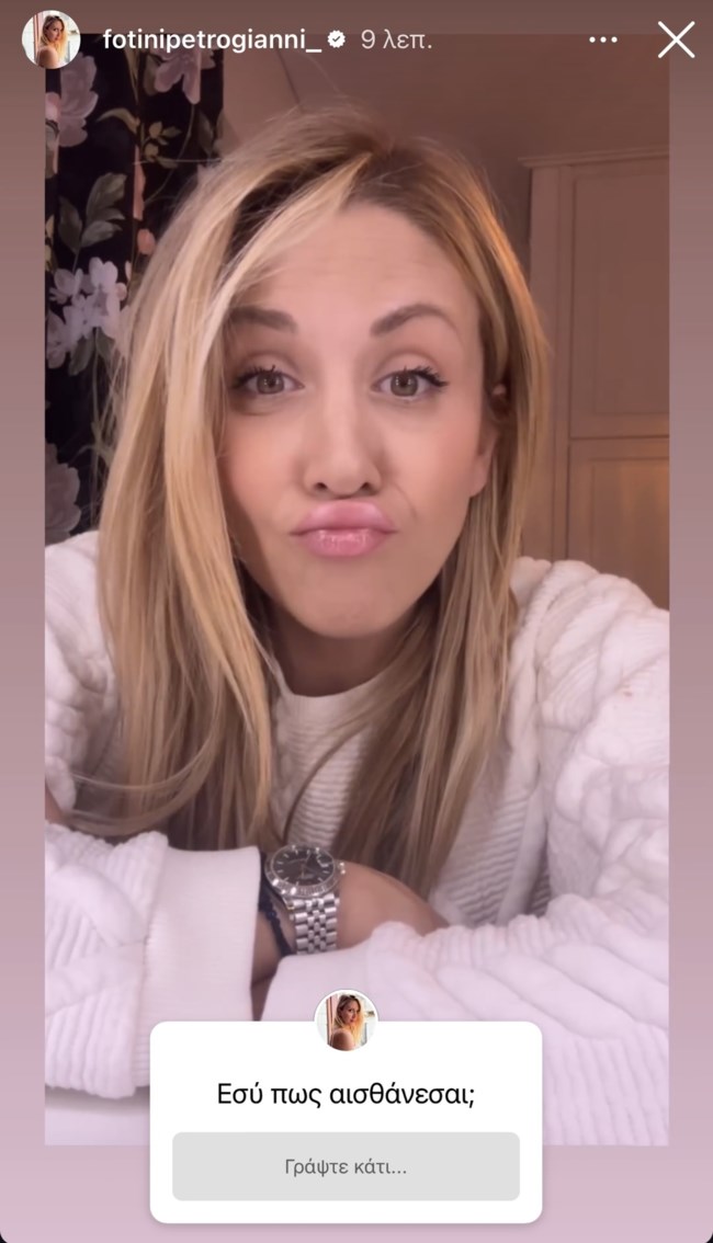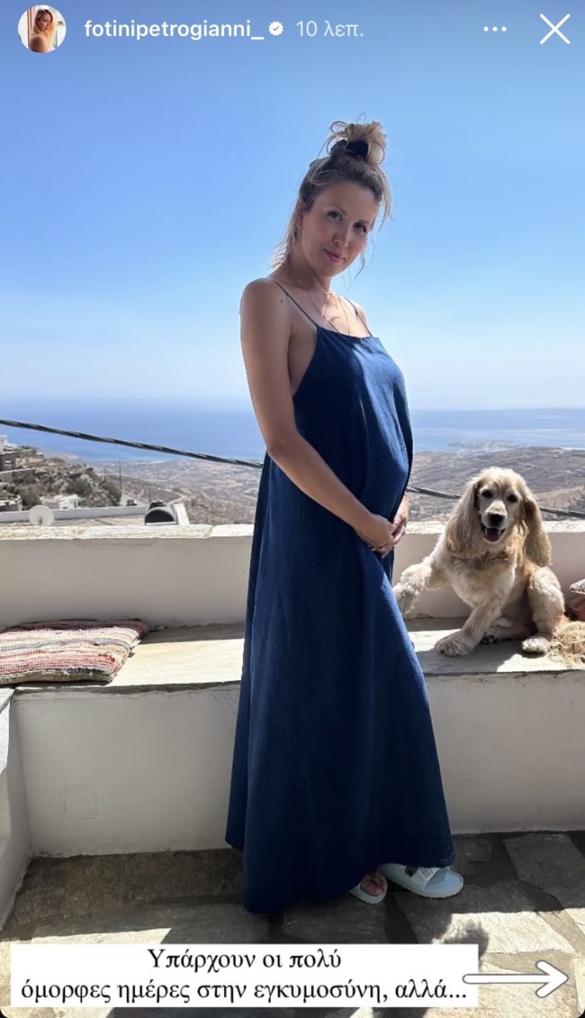 Το βράδυ της Τετάρτης (23/1) η Φωτεινή Πετρογιάννη δημοσίευσε δύο Instagram stories, μέσα από τα οποία θέλησε να μιλήσει για την εμπειρία της τους τελευταίους μήνες. Αρχικά, κοινοποίησε μια τρυφερή φωτογραφία της, στην οποία φαίνεται η φουσκωμένη κοιλιά της και ανέφερε: "Υπάρχουν οι πολύ όμορφες ημέρες στην εγκυμοσύνη, αλλά..."