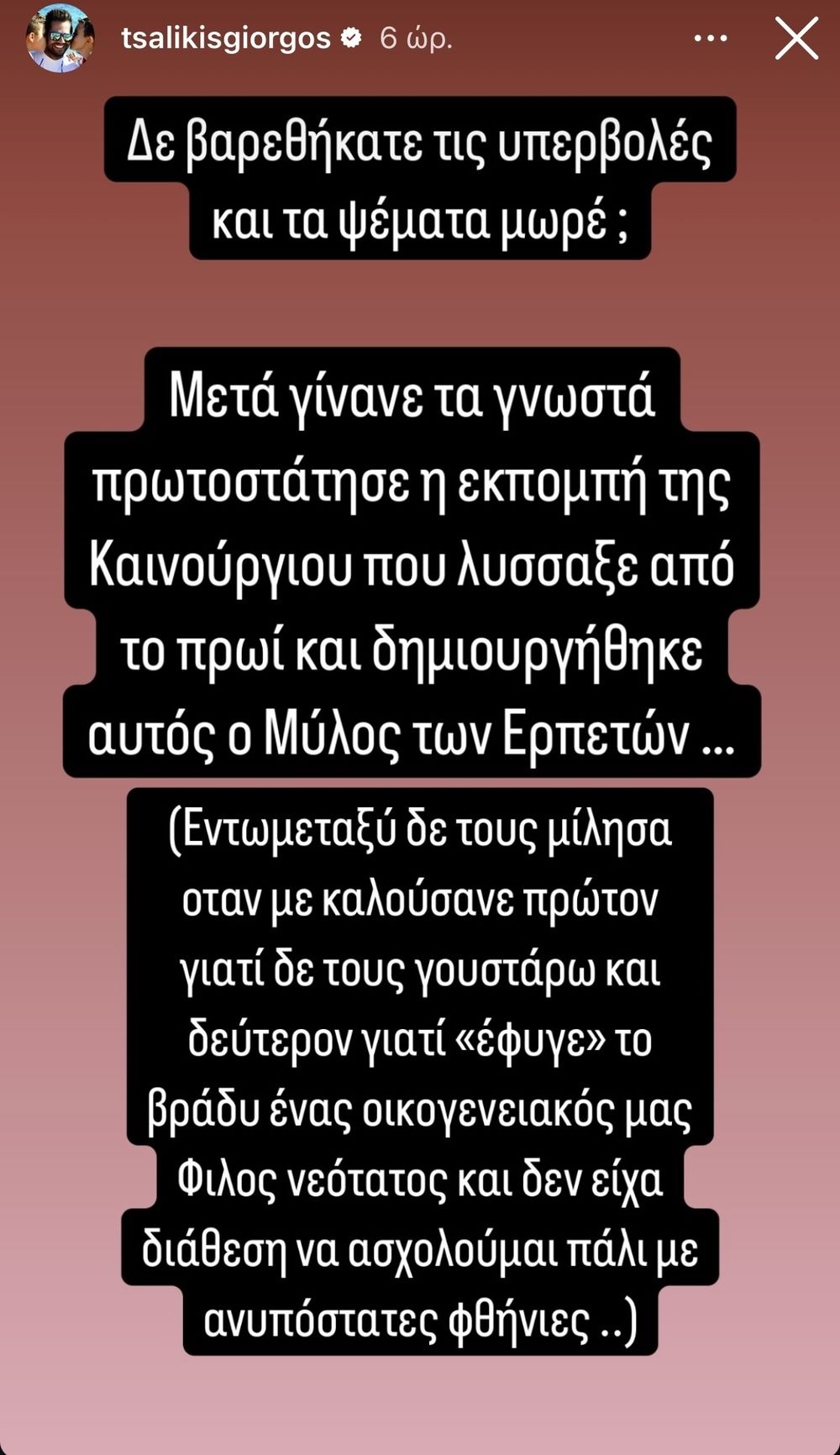 Ειδικότερα, κοινοποιώντας μια σειρά από Instagram stories, ο Γιώργος Τσαλίκης τόνισε:"Δεν βαρεθήκατε τις υπερβολές και τα ψέματα μωρέ; Στα άπειρα live τόσα χρόνια γινόμαστε παρέα αγάπης και χαράς. Περνάμε μηνύματα πίστης, αισιοδοξίας, αυταξίας, γελάμε, πολλές φορές κλαίμε.. Στις 2-3 ώρες προγράμματος υπάρχει από το 2012!!!! το "απαγορευμένο” που είναι μαντινάδες χαβαλετζίδικες με φουλ μπινελίκια που ξεκίνησε για πλάκα και μετά από τόσα χρόνια παντού και πάντα μου το ζητάνε για να γίνει πλάκα! Εννοώ δε βριζόμαστε μεταξύ μας!! Ούτε βρίζουμε κάποιον, ούτε το χώρο που βρισκόμαστε... Στο χθεσινό υπέροχο live στον Μύλο Των Ξωτικών αυτό ακριβώς έγινε. Μου ζήτησε ο κόσμος και είπα το "απαγορευμένο”. Το πρώτο μισάωρο κιόλας της συναυλίας. Ούτε διαμαρτυρήθηκε κανείς, ούτε έμεινε κανένας αποσβολωμένος, ούτε θύμωσε ο Δήμαρχος. ΟΛΑ ΨΕΜΑΤΑ".