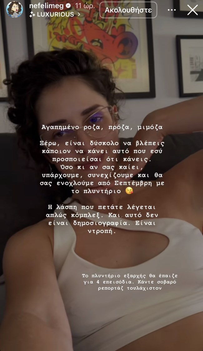 Ειδικότερα, μέσα από ένα Instagram story, η γνωστή youtuber ξεκαθάρισε πως από την αρχή η συμφωνία που είχε κάνει ήταν για τέσσερα επεισόδια του "Πλυντηρίου", ενώ τόνισε -μεταξύ άλλων- πως θα επιστρέψει στην τηλεόραση από τη νέα σεζόν. Στην ανάρτησή της σημείωσε:
