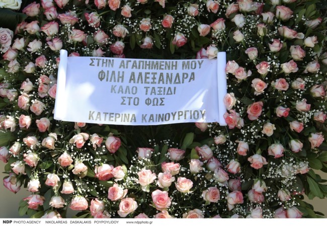 Το στεφάνι που κατέθεσε η Κατερίνα Καινούργιου έφερε επίσης ένα ιδιαίτερα συγκινητικό μήνυμα "Στην αγαπημένη μου φίλη Αλεξάνδρα, καλό ταξίδι στο φως".
