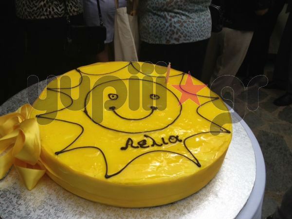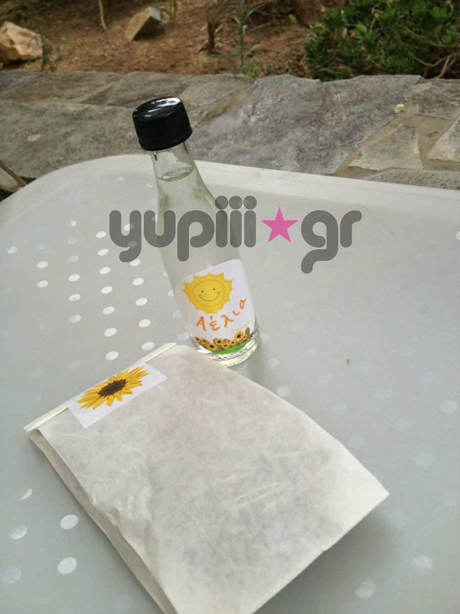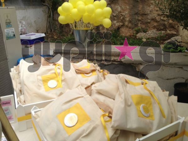 Το κίτρινο χρώμα του ήλιου και οι κρητικές παραδόσεις ήταν τα βασικά στοιχεία της βάφτισης: Οι καλεσμένοι έπαιρναν ως αναμνηστικό, μεταξύ άλλων, ένα cd με κρητικά τραγούδια αλλά και ένα μπουκαλάκι με τσικουδιά.