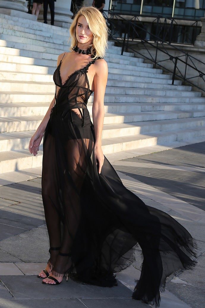 Τα φωτογραφικά φλας κατάφερε να μονοπωλήσει η Ρόζι Χάντινγκτον Γουάιτλι κατά την άφιξή της στο fashion show του οίκου Atelier Versace στην Εβδομάδα Μόδας του Παρισιού, επιλέγοντας να φορέσει ένα σιθρού φόρεμα.