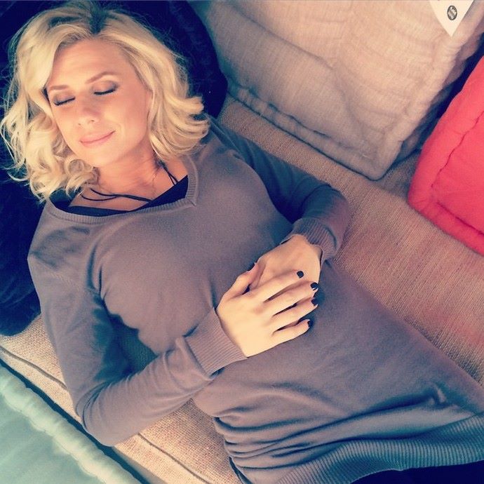 Η εγκυμονούσα Κατερίνα Καραβάτου σε ένα διάλειμμα από τις επαγγελματικές της υποχρεώσεις