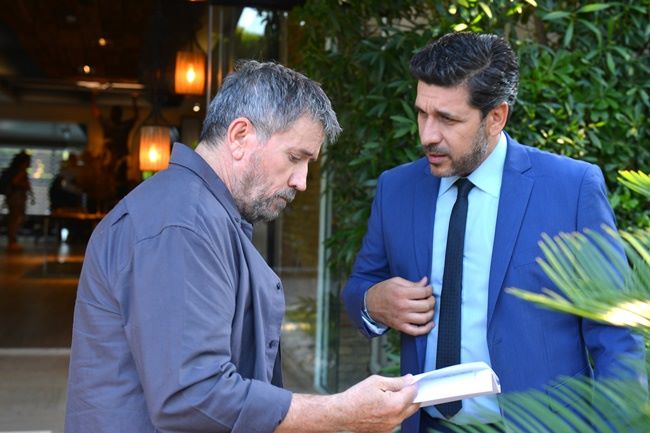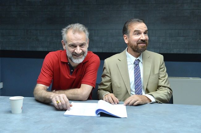 Κάνε ότι κοιμάσαι Τάσος Γιαννόπουλος (Ηλίας Βανδώρος, τοκογλύφος) και Δημήτρης Καλαντζής (Παύλος, δικηγόρος Βανδώρου)
