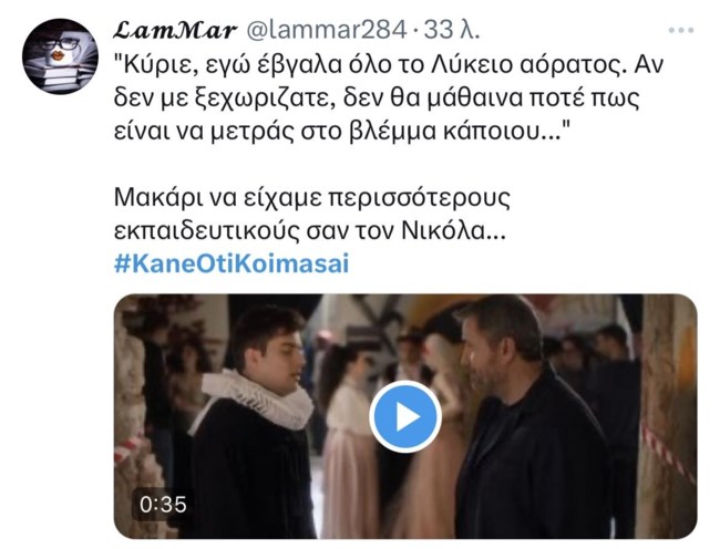 Η δημοφιλής σειρά της ΕΡΤ "Κάνε ότι κοιμάσαι" έριξε αυλαία για αυτή τη σεζόν. Οι τηλεθεατές είδαν ένα συγκλονιστικό φινάλε και οι χρήστες του twitter είχαν πολλά να πουν. Μάλιστα δεν σχολίασαν μόνο καυστικά και με χιούμορ τις εξελίξεις, όπως συνηθίζεται στην πλατφόρμα, αλλά και με μεγάλη συγκίνηση για τους χαρακτήρες και τις ερμηνείες των ηθοποιών.