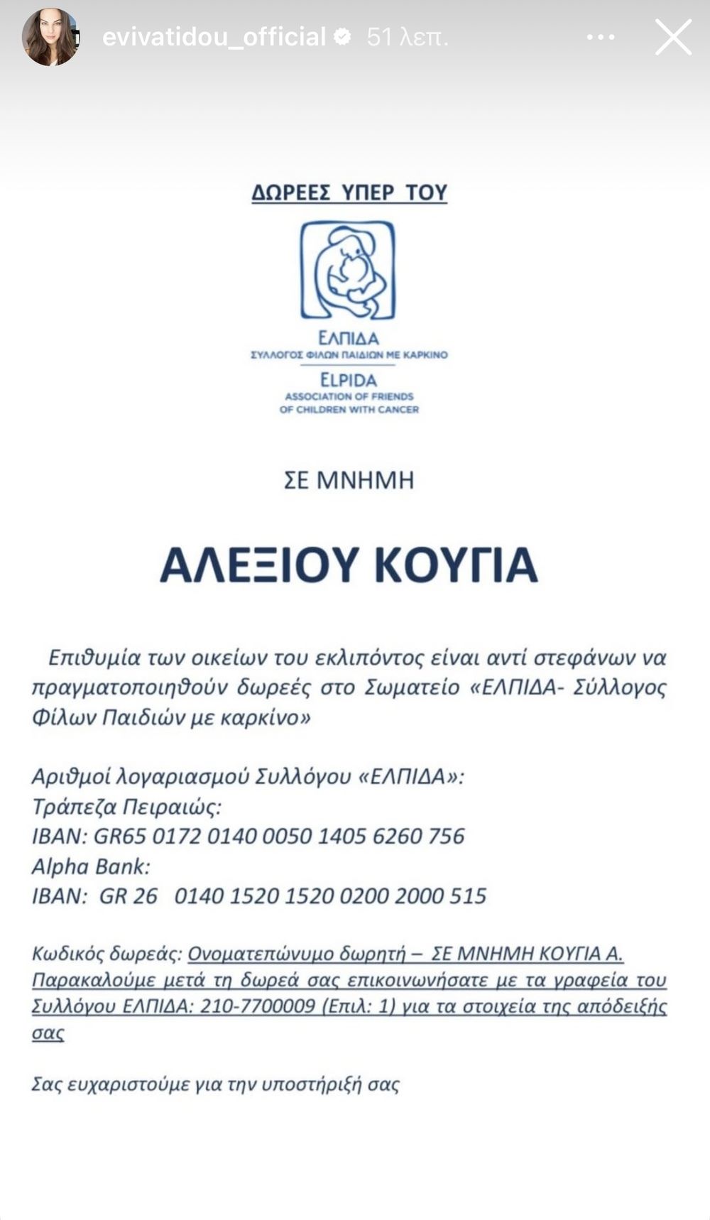 Όπως αναφέρει η ανακοίνωση, την οποία δημοσίευσε και η Εύη Βατίδου στον προσωπικό της λογαριασμό στο Instagram, το δικηγορικό γραφείο δε θα λειτουργήσει τη συγκεκριμένη μέρα, ενώ επιθυμία των οικείων του εκλιπόντος είναι αντί στεφάνων να πραγματοποιηθούν δωρεές υπέρ του Συλλόγου Φίλων Παιδιών με Καρκίνο "Ελπίδα"