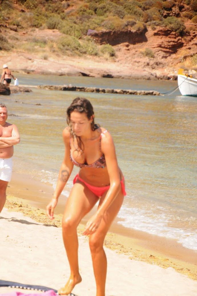 Βέβαια στο νησί πλατσουρίζει και ένα άλλο αξιομνημόνευτο κορμί. Αυτό της Έλενας Παπαβασιλείου που πήγε για μπανάκι και ή ήταν κρύα η θάλασσα ή κάποιος την είχε πειράξει και είχε μουτρα.